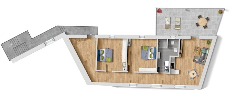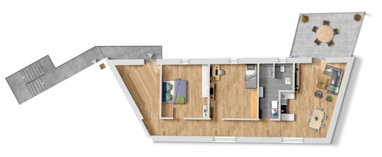 Die dargestellten Pläne, einschließlich der 3D-Ansichten von Küche und Bad, dienen nur der beispielhaften Darstellung. Abweichungen von der tatsächlichen Ausführung sind möglich.