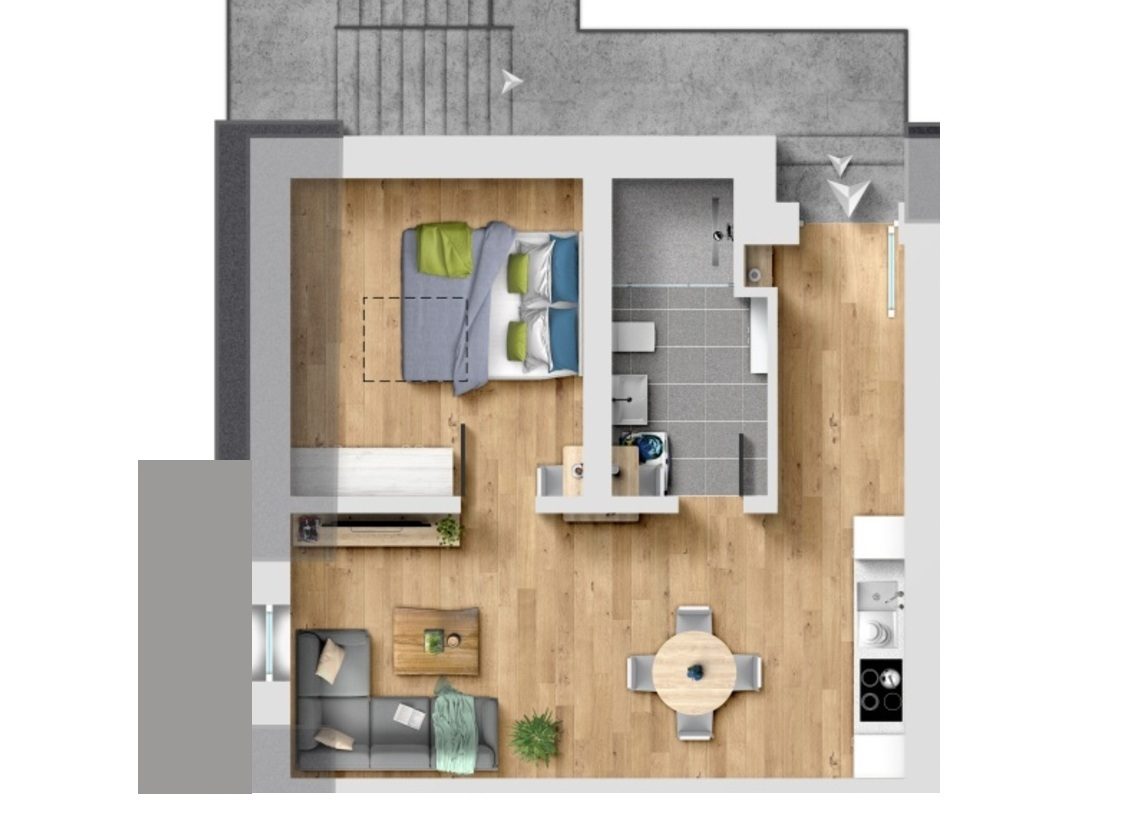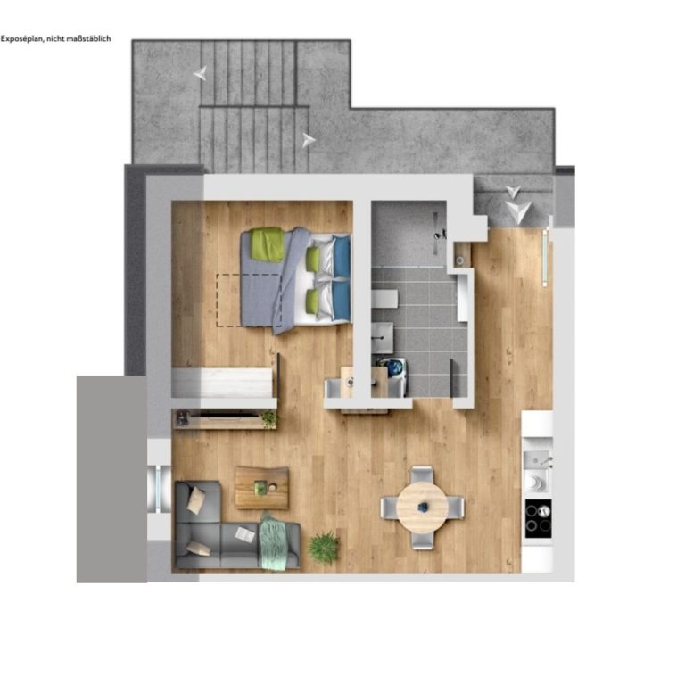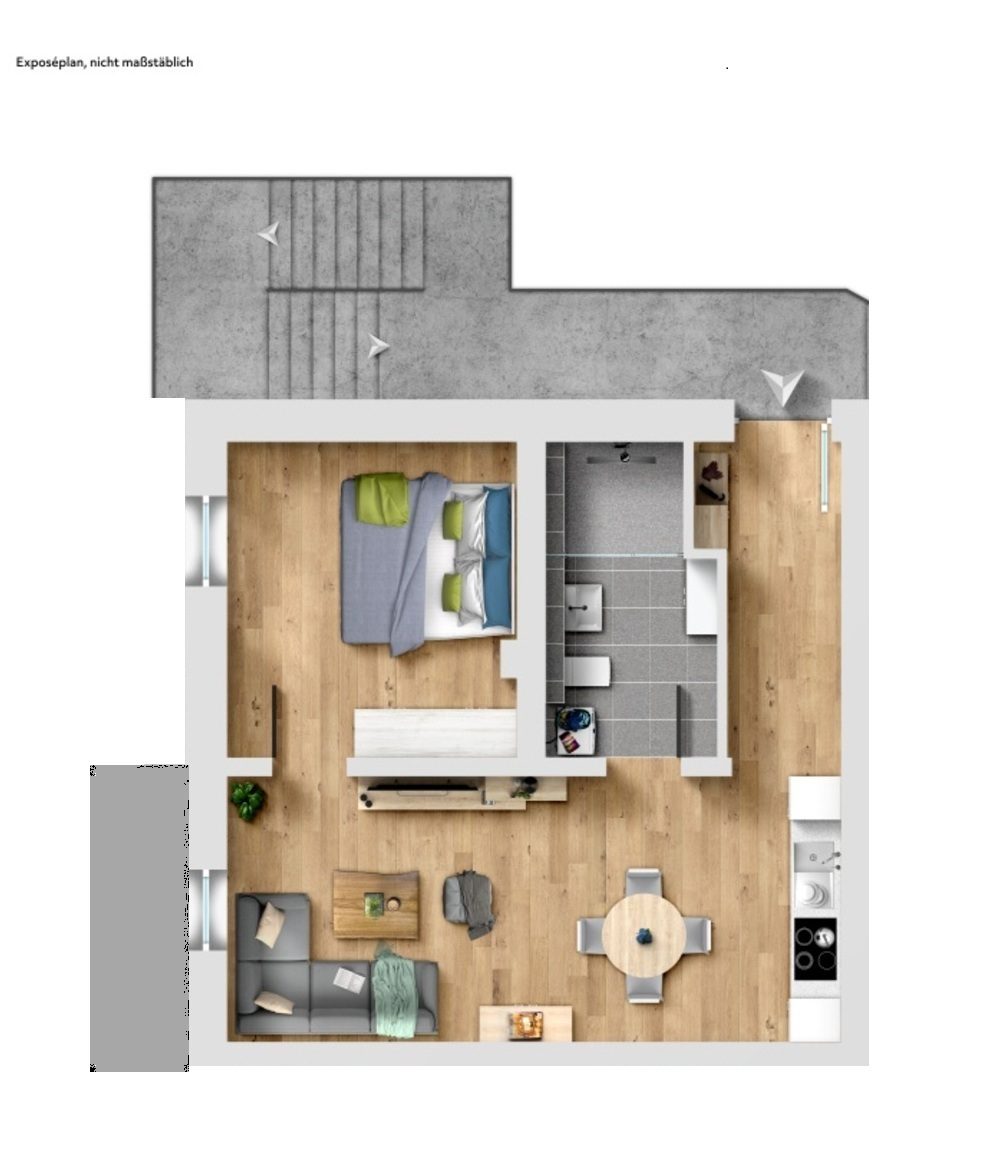 Die dargestellten Pläne, einschließlich der 3D-Ansichten von Küche und Bad, dienen nur der beispielhaften Darstellung. Abweichungen von der tatsächlichen Ausführung sind möglich.