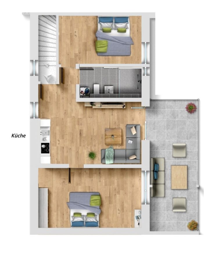 Die dargestellten Pläne, einschließlich der 3D-Ansichten von Küche und Bad, dienen nur der beispielhaften Darstellung. Abweichungen von der tatsächlichen Ausführung sind möglich.